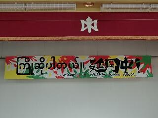 今週の19日(木)に、ミャンマー研修生15名が本校を訪れます。3年生を中心に交流会の準備が進んでいます。今日は、体育館に交流会の看板が設置されました。描いたのは美術部です。ミャンマー語で「ようこそ」延岡中へと書かれてあります。印象に残る交流会になればと思います。