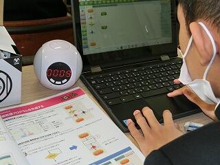 技術の時間には、プログラミング学習を実施しています。クロックライトのコントロールをプログラミングで行っています。生徒も課題をもって熱心に活動しています。