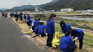↓ 市内の中学生が作成した風車を会場に設置する岡富中Ⅰ年生