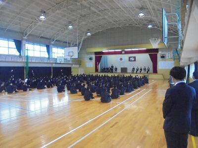 本日は、生徒集会が行われました。内容は、「いじめ撲滅3か条」と「あいさつの発声練習」について、生徒会役員が実演しながら説明をしました。いい取組ですね。いじめ、ダメ、絶対!そして、気持ちのよいあいさつがさらに増えますね。
