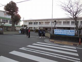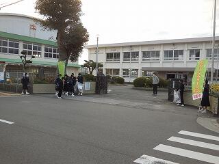(下、朝の登校指導の様子、担任先生方が校門で出迎えました)