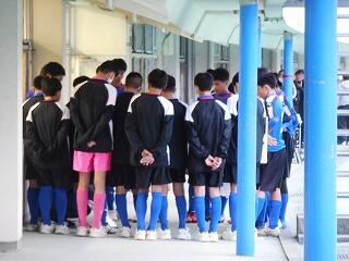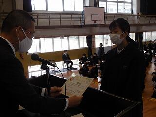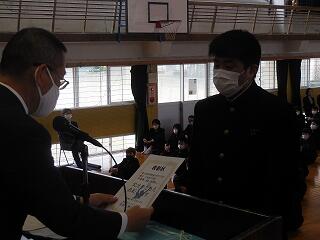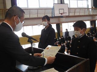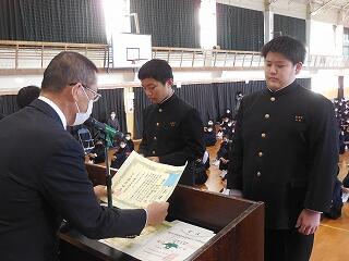 (下、始業式の様子、リモートで実施しました。式の前に年末に行われた市大会で準優勝したサッカー部を表彰しました)