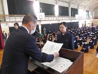 本日は木曜校時の6時間授業です。朝は全校集会があり表彰を行いました。また1時間目は2年2組で国語の研究授業(甲斐聖先生)、5時間目は1年2組で総合的な学習の時間の研究授業が行われます。