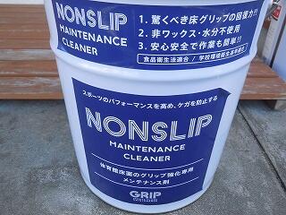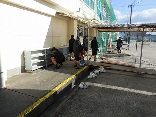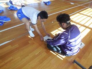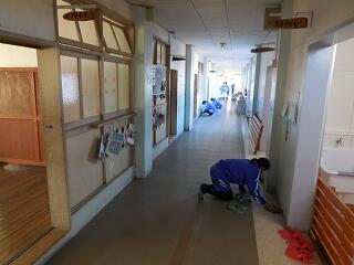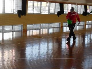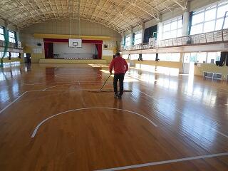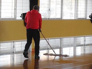 (下、午前中体育館フロアのすべり止め施行が行われました。まず、清掃)
