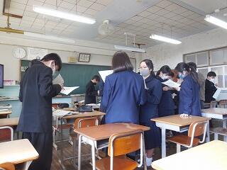 本日昼休みから、集会等で校歌斉唱が出来ないときを想定して、代わりに流すことができる音源(CD)を作成することを目的に「歌声を残そうプロジェクト」が始まりました。3年生の有志が音楽室に集まり校歌の練習を開始しています。今週末には録音をして、万が一終業式等で校歌斉唱が出来ない場合に放送によって校歌を流すことになります。参加している3年生有志の皆さん、ありがとうございます。
