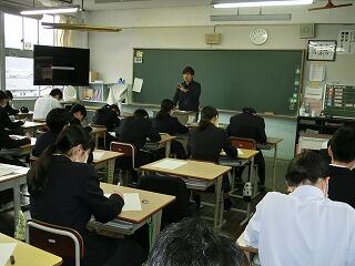 地元で働く方々を招いて授業を実施しました。来ていただいたのは、FMのべおか、住環境工房SHIDA、延岡警察署で働く方々の3名です。現在、どんな仕事をしているのかの説明を受けたり、生徒が疑問に感じたことなどを質問したりしました。日頃知らない仕事の内容などを知ることができ、生徒たちも熱心にメモをとりながら聞き入っていました。