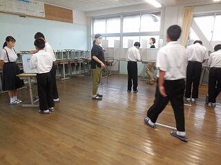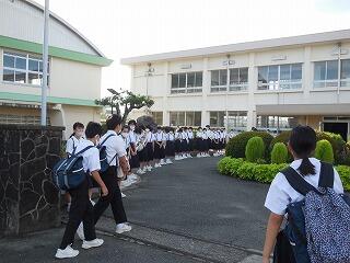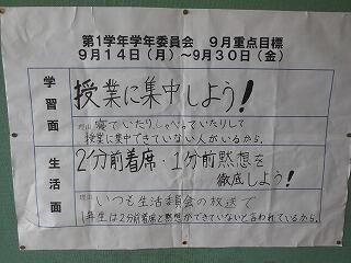本日は5時間授業です。今日は生徒会生活委員会からの提案で、ノーチャイムデーとなっており、チャイムが終日なりません。時計を見て2分前着席、1分前黙想を行います。5時間目は全学年道徳の授業です(題材は1年生が「六十二枚の天気図」、2年生が「段ボールベットへの思い」、3年生は「根本を究めて」)。保健体育の授業では、10月9日(金)に予定されている体育的行事(今年は特別体育競技会)の準備ための体作り運動が本格化しています。