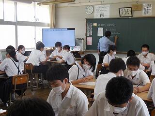 本日は6時間授業です。朝の時間に全校集会を実施しました。内容は生徒指導に関する講話で、「誰もが気持ちよく学校生活をおくるために気を付けて欲しいこと(人間関係)」、「SNSの使用等(つながり)」についてでした。生徒指導担当の先生の話を生徒は真剣に聞いていたと思います。午後の総合的な学習の時間は、全学年キャリア教育を行いました。今年度の総合的な学習の時間では、臨時休業を踏まえキャリア教育を再編成した内容で取り組んでいます。最初の8時間は全学年共通内容で行い、その後(10月22日以降)は、学年毎に内容を変更して行う計画です。コロナ禍の中、本校では様々な取組を進めています。