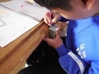 本日、2年生の美術の授業で篆刻を行っています。一人一人が自分の名前などをモチーフにデザインを決め、高蝋石(印)に写していました。