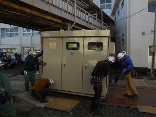 本日朝から、空調整備事業の最大の設備であるキュービクル式高圧受電設備の設置工事が行われました。キュービクル式高圧受電設備とは、電力会社から高圧で送られてきた電気を受電するための機器一式を金属製の外箱に収めたもののことで、単に「キュービクル」(Cubicle) とも呼ばれるそうです。九州電力から約6,600Vで受電しキュービクル内で100Vまたは200Vに変圧され、学校内に供給されるとのことです。今日はキュービクルを積んだトラックが渡り廊下を通れず、トラックから一端降ろして人の力で移動させるなど、大変な作業が続きました。工事関係者の皆様、早朝より御苦労様です。