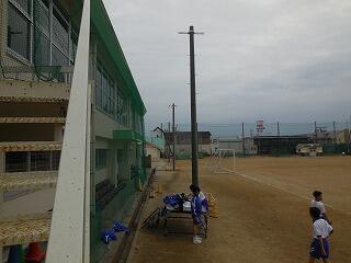 本日は朝から体育館南側で電柱設置工事が行われています。