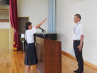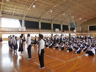 本日6時間目終了後に、明日9月28日から30日まで開催される延岡地区中体連秋季大会、28日に開催される県中体連水泳競技会の推戴式を体育館で行いました。本校からは地区大会に、野球、男女バスケット、男女ハンドボール、サッカー、女子バレーボール、男子ソフトテニス、女子ソフトボール、剣道、陸上に参加します。また、県中体連(水泳)大会には、3名の生徒が参加します。各部の代表のあいさつの後、生徒会長の山本さんから激励の言葉がありました。最後にソフトボー部主将が選手宣誓をしました。この大会は1・2年生だけで競技する最初の公式大会です。いざ試合となると緊張やプレッシャーもあると思いますが、これまで培ってきた力を遺憾なく発揮して欲しいと思います。選手の皆さん、頑張ってください。