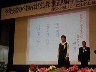 先週の土曜日(10月19日)にはげまし隊の10周年記念式典が延岡市カルチャープラザのべおかで行われました。その中で、はげまし隊の川柳で本校1年生が優秀賞に選ばれ表彰されました。また、それに先だって、継続従事10年経過隊員、5年経過リーダーの表彰で、佐藤賢司様、渡部宏様の表彰もありました。本校には、15名のはげまし隊の皆さんが1年生の数学の授業を中心に活動していただいています。改めて感謝を申しあげます。