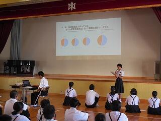 本日朝、生徒集会を行いました。まず、生徒会長が、8月27日の始業式に実施した生徒アンケート結果の報告を行いました。次に、10月29日(火)の生徒総会の全体討議で協議する身近な人権問題(いじめや差別等)について、生徒会役員の皆さんが、一人ずつ問題提起やこれまでの経験等を発表しました。内容は大変素晴らしく、生徒の皆さんの過去の経験やいじめや差別等にどう立ち向かっていったかなどの経験を発表しました。生徒の皆さんは真剣に話を聞いていたと思います。大変、インパクトのある生徒集会でした。生徒会のみなさん、大変ありがとうございました。
