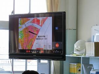 まず、津波についての学習です。本校までの津波到着時間・津波の高さについてオンラインで学習しました。