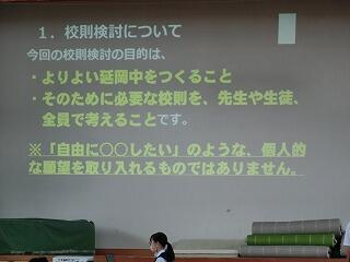 ・私たち生徒会では、この1学期に「礼儀を重んじる学校」「地域の貢献する学校」「いじめのない学校」を目指して取り組んできました。・・・また、校則に関するアンケートでは、多くの生徒の皆さんから、たくさんの意見を出していただきました。・・・2学期も全校生徒でよりよい延岡中をつくっていきましょう。