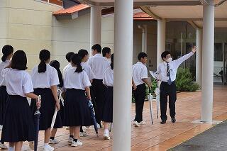 夏休みに入ってすぐの8月4日(金)に、生徒会が企画・運営に当たる「ミステリーバスツアー」を実施しました。バスで巡るのは、延岡市津波ハザードマップに掲載してある延岡中校区の指定緊急避難場所38か所の中の数か所です。実際に避難施設に登ったり、バスの中から見学したりしました。この活動のねらいは、