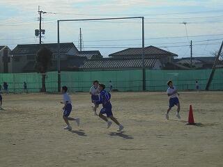 (下、1時間目の3年生、保健体育で長距離走をみんな真剣に走っています)