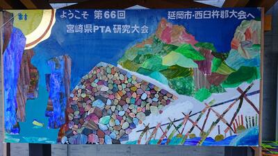 本日正午から野口遵記念館にて第66回宮崎県PTA研究大会延岡市-西臼杵郡大会が開催されました。本校PTA会長松本清孝会長が延岡市を代表して、本校の取組を発表されました。また、永年の功績を称えられ功労者として表彰されました。誠におめでとうございます。会場入口には、本校の美術部が作成したウェルカムボードを展示しています。参加された皆様、役員の皆様、美術部の皆さん、大変お疲れ様でした