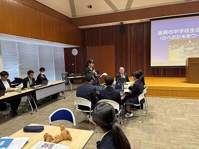 本日、市役所講堂で「令和6年度のべおか未来ワークショップ」(延岡市中学校生徒会サミット)が開催され、本校から生徒会役員3名が参加しました。市内の中学校生徒会役員が、延岡市の明るい未来を拓く起業アイディアを話し合い、ワークショップで練り上げ、市長に発表しました。自他の幸せを願うよりよい延岡市民となる心構えを学びました。本校3人もよくがんばりました。