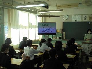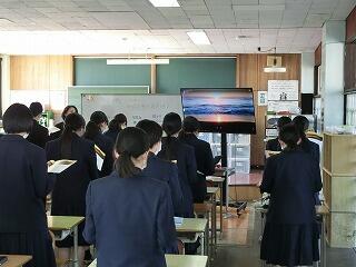 生徒からは、「楽譜は頭に入っているので、延岡の海岸を見ながら歌いたい」と提案があり、「方財海岸」の写真を見ながら歌うことになりました。