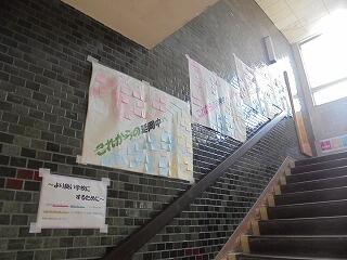 (下、先日「より良い学校にするために」という内容で本校新旧生徒会執行部と教職員、学校運営協議会の委員様による協議が行われました。その協議で用いた資料を是非全校生徒の皆さんにも見てほしく、1棟の階段に掲示しています。また、この協議の様子は夕刊デイリーに取材していただき、取り上げていただいています。)