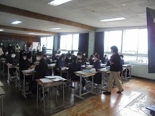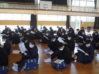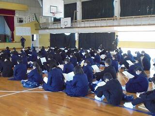毎月実施していただいたボランティアによる「読み聞かせ」も、本日の3年生で最終回になりました。「身をのりだすように聞き入る生徒」「早口言葉をいっしょにやってみる生徒」等、ボランティアの皆様方のおかげで、朝の時間を充実させることができました。この時間の最後には、3年生各クラスの代表が、「とても充実した時間になりました。朝の時間に気持ちを落ち着かせ、1日のスタートが切れました。ボランティアの方々もお体を大事に、この活動は続けてください。ありがとうございました。」とお礼のことばが述べられていました。本当に朝の貴重な時間に来ていただき、その時期や学年にあったお話をたくさん聞かせていただきました。お世話になりました。ありがとうござました。