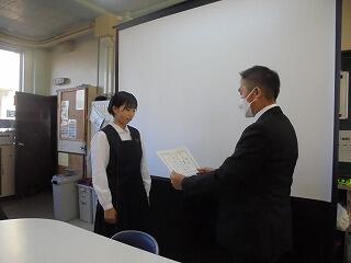【ご退職の先生に感謝状贈呈】 【生徒代表からのお礼のことば】