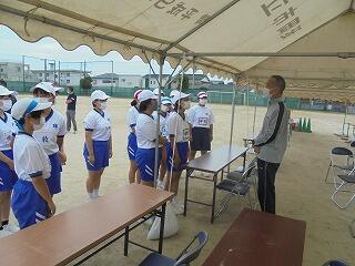 (下、8月上旬に行われる九州中学校総合体育大会に本校からソフトボール部と硬式テニス競技(シングルス)が出場します。全校生徒を前に、九州大会での意気込みを述べてくれました。本校全校生徒・全教職員一同、活躍を期待しています。)