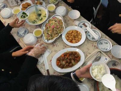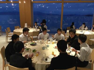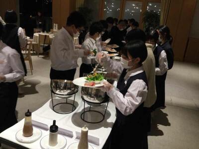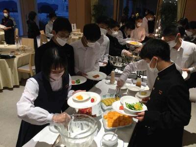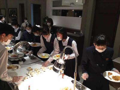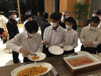 感染対策をしながら夕食を楽しみます。みんなすごい勢いで食べてます。