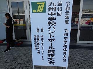 九州中学校体育大会ハンドボール競技が8月8日(木)から、宮崎市で開催されています。本校から参加している女子ハンドボール部の結果をお知らせします。試合は本日からでした。1回戦は長崎県代表の大野中学校(長崎1位)と対戦し、19ー16で勝利しました。2回戦は熊本県代表の宇土鶴城中学校(熊本1位)と対戦し、10ー21で惜敗しました。九州ベスト8の結果です。大変立派な成績です。また、大分県で開催されていた相撲の九州大会では予選リーグを2位で通過しましたが、決勝トーナメント1回戦で敗退しベスト8でした。個人戦に参加した下田君も予選敗退でした。選手の皆さんご苦労様でした。保護者の皆様応援ありがとうございました。顧問の新玉先生、コーチの甲斐さん、引率の矢野先生、御指導ありがとうございました。