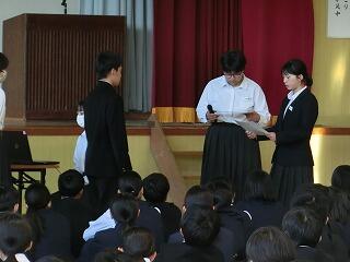生徒集会を実施しました。生徒集会は、生徒会が自分たちで企画・運営する集会です。今回は、図書委員会の「全校しおりコンクール」の表彰を行いました。また、校則についての説明を行いました。
