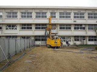(下、渡り廊下の改修工事では地盤改良工事が始まりました)