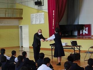 まず最初に、令和5年度延岡市自転車安全推進校の指定証を生徒会代表が受け取りました。