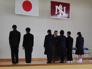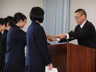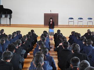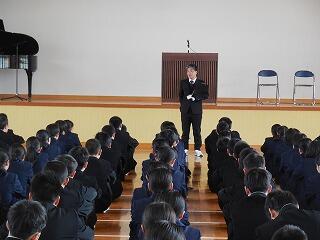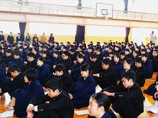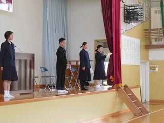 本日は2学期終業の日です。日数で120日、授業日で83日あった2学期が大きな成果を残して無事に終了しました。今日は大清掃のあとに体育館で生徒会からの連絡(集会)、表彰伝達、その後終業式が行われました。生徒会の表彰は、学力クラスマッチと校内学級掲示コンクールでした。また生徒会から年間スローガンの発表もありました。年間スローガンは「Smile~いじめゼロ!明るいあいさつ!地域に貢献!~」となりました。校納・表彰では、ソフトボール部(地区対抗戦優勝)、サラリーマン川柳2019年度小中学生サラ川選手権(学校団体賞、全国で3校です)、ソフトテニス学年別大会優勝、読書感想文県入選、読書感想画県三席、市人権作文奨励賞、第59回延岡市BFC防火作品展秀作、英語検定準2級、歯科治療完治賞(1年3組、サッカー部)がそれぞれ披露・表彰されました。その後、式が行われ、諸連絡で学習・生活・保健面から注意等が各先生からありました。式終了後は学年別に集会、最後は学級の時間で給食後下校となりました。2週間ほどですが、生徒の皆さんには充実した冬休みを過ごして欲しいと思います。