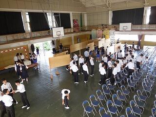 今日は明日の文化発表会の準備と授業を並行して行っています。また、各学年リハーサルも行っています。明日10月13日(日)は午前9時から開会式、9時10分~英語暗唱・弁論、9時25分~2年生の発表、9時55分~1年生の発表、10時35分~合唱コンクール、13時20分~吹奏楽部演奏、13時50分~3年生の発表、14時10分~閉会式、閉会式後に生徒会任命式も行います。