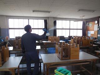 本日朝から、第一環境管理(株)様による校内の消毒作業を行っていただきました。消毒作業としては、次亜塩素酸水(病院等で使用する消毒液)の噴霧によるによる空間消毒、ドアノブなどのアルコール消毒清掃でした。校内全ての教室・施設に実施していただきました。来週以降の分散登校等に向けて大変ありがたいことです。お忙しい中、消毒作業に当たっていただきました板谷様をはじめ、第一環境管理(株)の皆様ありがとうございました。