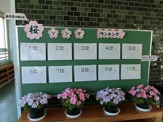 いよいよ明後日16日(木)が卒業式です。春は、別れと出会いの季節です。延岡中生徒が、この時期にどんな曲を聞いているのか?音楽室前の掲示板にアンケート結果が掲示されています。どんな曲が入っていると思いますか?