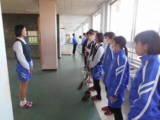 本校では、無言・気づき清掃に取り組んでいます。清掃が始まると、誰も話さず真剣に所定の場所の清掃に取り組み、その後、気づきの清掃として、気がついた箇所の清掃を行います。生徒の皆さんは、この活動のお陰で落ち着いた気持ちで帰りの会を迎え、そして下校しています。