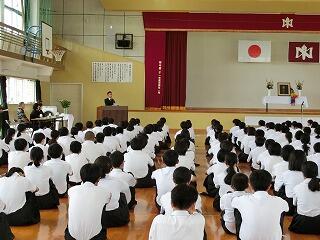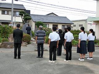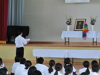 栗田先生の御遺族3名、慰霊碑の文字を書かれた方の関係者1名をお招きし、体育館で実施しました。