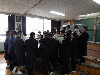 本日朝のあいさつ運動は、吹奏楽部の皆さんが行ってくれました。また、朝自習の時間には、1年生を対象に読み聞かせが実施されました。1組は「ねずみのよめいり」「羽田の水舟」「ともだちや」、2組は「てぶくろ」「ゆきがたくさんつもったら」「ちいさなはくさい」「こんこんさまにさしあげそうろう」、3組は「じゃない!」「ぜつぼうの濁点」「だいじょうぶだいじょうぶ」を読んでいただきました。朝のお忙しい中、読み聞かせをしていただいたゆめの宅急便・卒業生保護者の皆様、ありがとうございました。次回は1月28日(火)、2年生を対象に読み聞かせが計画されています。よろしくお願いします。午後は、音楽の初任研指導のため岩村先生(岡富中)が来校されました。また、今日から「全ての学校に新聞を」運動で、全クラスに新聞(3学期は読売新聞)が配付されています。他に今週は清掃徹底週間・校内安全点検集会にもなっています。無言・気づきの清掃の徹底や校内危険箇所の発見と対応などをしっかり行っていきたいと思います。