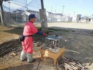 (下、技術員さんが、剪定した樹木片を薪ほどにしています。)