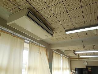 現在、空調設備工事と第3棟屋上の太陽光発電工事が同時に進んでいます。先日の工事で1年生教室内に室内機器が設置されました。太陽光発電工事も順調に工事が進んでいるようです。