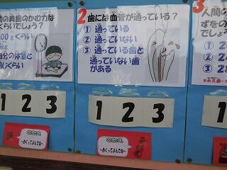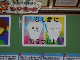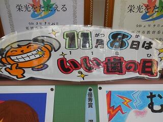 (下、保健室前の掲示物、11月8日のいい歯の日に因んで歯の特集です)