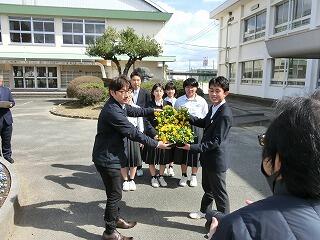 のべおか花物語の後、花のモニュメントで使用した花の苗をAEON九州、ホームワイド出北店から贈呈していただきました。生徒会が代表して受け取りました。3月の卒業式に向けて、学校内を花で彩ります。ありがとうございました。