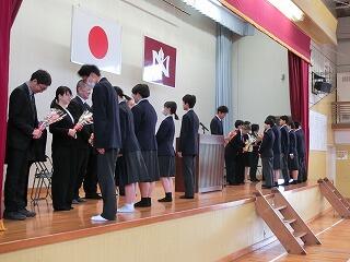 本日が令和5年度の修了の日です。修了式では、各表彰の後に、修了式を実施しました。式では、1・2年の代表生徒に「修了証書」を授与し、各学年代表や生徒会代表による1年間の反省と次年度の抱負が述べられました。発表した3名ともに、しっかり自分自身を振り返り、前向きな次年度の表負が語られました。次年度も楽しみです。