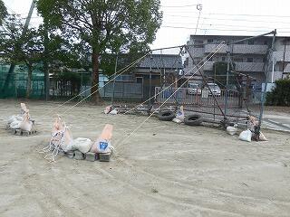 (台風に備えロープと土嚢で固定されたソフトボールのバックネット、片付けられた玄関前の花壇)