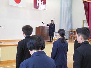 本日午前中、清掃の後に3学期の始業式を行いました。式では4人の生徒の皆さんが、新年の抱負や目標についてそれぞれ発表してくれました。1年生の重黒木さんと2年生の白坂くんは、3学期が新年度の準備の学期であることや2学期の振り返りを踏まえた具体的な目標などを発表してくれました。3年生の黒木さんは、これから臨む高校入試への決意と中学校生活をしっかりと締めくくりたいという気持ちを述べてくれました。生徒会の下田くんは、いじめや差別をなくす生徒会の取組について、具体的な話をしてくれました。式終了後の諸連絡では、学習面で田中先生が「覚悟」について、生徒指導面で酒井先生が「気付く力」、保健面で廣木先生が「朝食の重要性」について、それぞれわかりやすくかつ生徒の心に残る話をしてくださいました。式は全校生徒の集合整列が6分で完了し、式自体も大変厳粛な雰囲気の中で行われました。全ての生徒の皆さんの意識の高まりを感じました。3学期の学校生活を充実したものにすることを全職員・生徒の皆さんが、決意(覚悟)した式になったと思います。