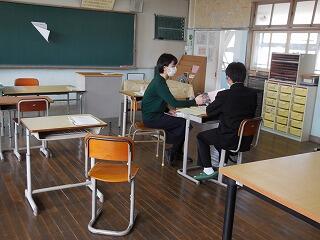 本日は午前中に1年生の心電図検診、午後は6時間目に、放送によるミニ生徒総会と部活動紹介が実施されます。3年生の教室では廊下側の窓が取り払われ、通常6列の机の並びを5列に減じて授業を受ける体制を作っています。