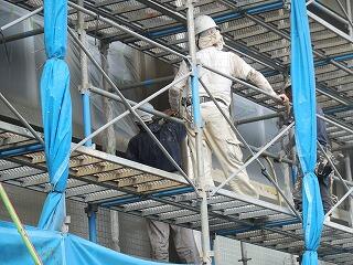 (下、第3棟外壁工事の様子、モルタルの吹きつけを行っています)